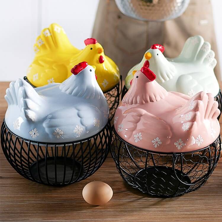- JÄRN & KERAMISK ÄGGHÅLLARE - Tillverkad av järntråd och en keramisk kycklingtopp är den här stora äggbehållaren tungt belastad, hållbar och mångsidig. Använd den för att hålla ägg, frukt, produkter och mycket mer. Med en stark metallbas kommer den att stå emot daglig användning. Lägg till vår svarta trådkorg med kycklinglock i ditt hem idag för en snygg och funktionell förvaringslösning.