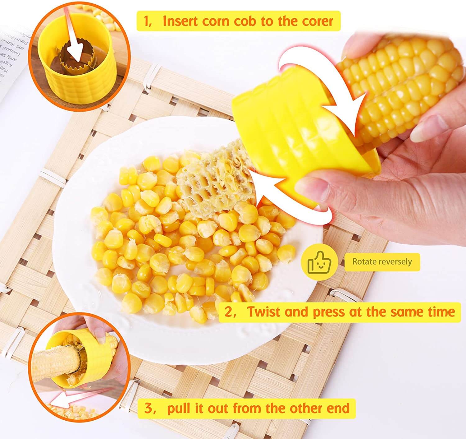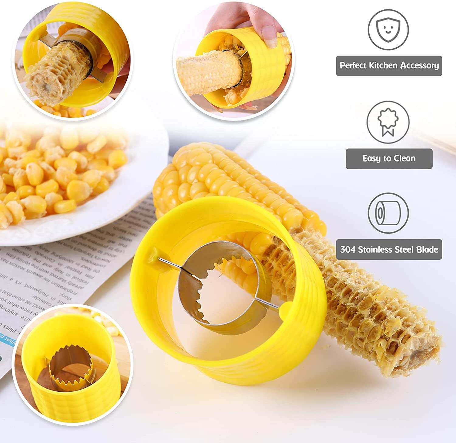 Låt oss få färska majskärnor på bara några sekunder! Den rostfria majsträskaren avlägsnar effektivt majskärnor med hjälp av det rundade säkra bladet. Slösa aldrig bort majs och bli inte skadad längre!