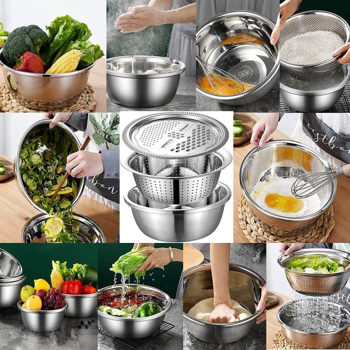 MÖTTA ALLA KINDER AV KOKNINGSBEHOV: Rostfritt stål gratänger för köket kan användas för strimling och skivning. används för att hacka grönsaker, ostrivare, snabb salladstillverkning och vegetarisk mattillverkning. livsmedelssilarna kan filtrera tillagad mat, pasta, grönsaker, ris och olika frukter. den 11-tums stora rostfria stålbassängen kan användas för att tvätta och skölja. en rostfri stålskål med lock kan användas för blandning, knådning och tillagning av mat. det är mer bekvämt att förvara mat.