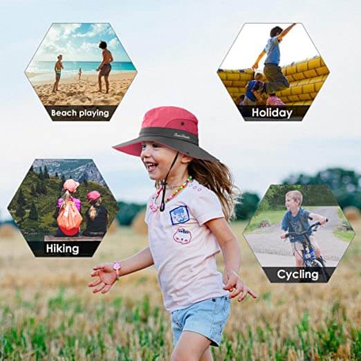 EXCELLENT UV-SKYDD: Den är tillräckligt bred för att ge ditt barn ett utmärkt solskydd, som skyddar barnets huvud, ögon, ansikte och hals från skadliga UV-strålar från solen, vilket innebär mer tid för utomhusaktiviteter. Den är vindtät, den justerbara hakremmen är hållbar och lätt att glida upp och ner, vilket säkerställer att sommarmössan inte faller i starka vindar.
