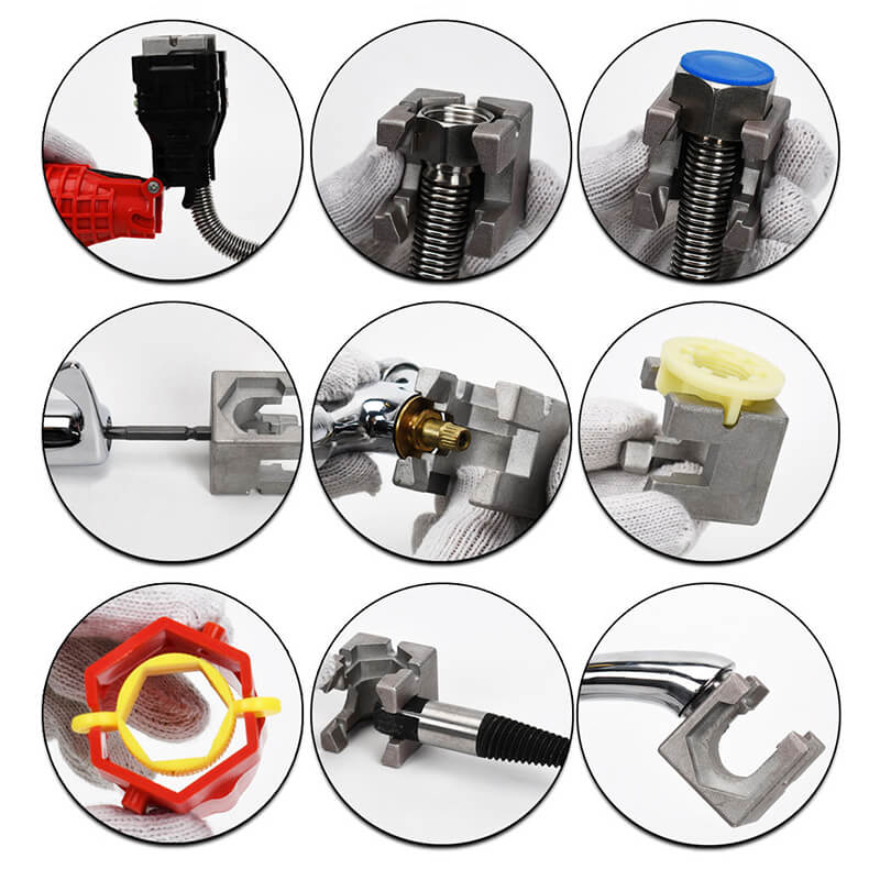18 i 1 krannyckelverktyg är oumbärligt för att ersätta en vanlig skiftnyckel i praktiskt taget alla situationer eftersom det passar lätt in i trånga utrymmen. Kranmonteringsverktyget är lämpligt för matningsmuttrar, avstängningsventiler, silkorgar, matningsmuttrar, kranmuttrar.