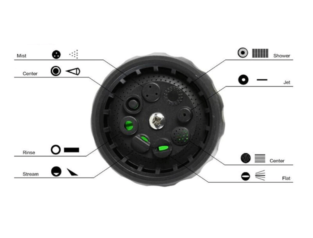 • 8 I 1 SPRUTMUNSTYCKE FÖR SLANG: Trädgårdsslangens sprutmunstycke har 8 typer av munstycken, spin- click spray selector olika inställningar (sköljning, ström, platt, centrum, jet, dusch, dimma och kon) som kan spruta ut vatten i 8 mönster för olika användningsområden, sprutmunstycke för trädgårdsslangen uppfyller dina olika behov.