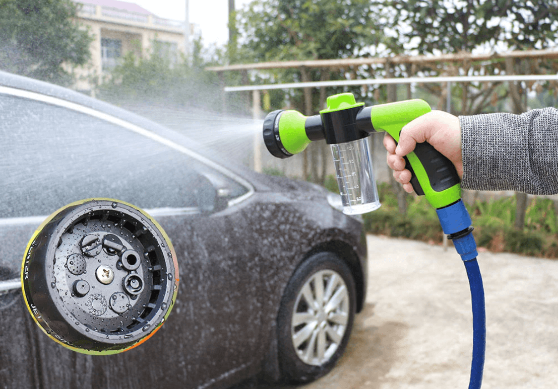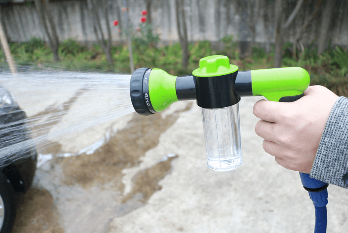 Den multifunktionella skumsprutan är också lämplig för att vattna trädgårdsväxter och gräs, eftersom trädgårdsslangens skummunstycke kan växlas fritt mellan skumfunktion och enbart bevattning. Med en enkel vridning av ett vred kan du justera din önskade tvålnivå och distribuera friskt eller tvålvatten i en perfekt och konstant takt, utan läckage! Med bara trycket från din trädgårdsslang kan denna tvålspruta ge en kraftfull sprutning (ca 74 psi/5,1 bar), vilket gör att du kan tvätta din bil grundligt och fullständigt utan att använda en hink!