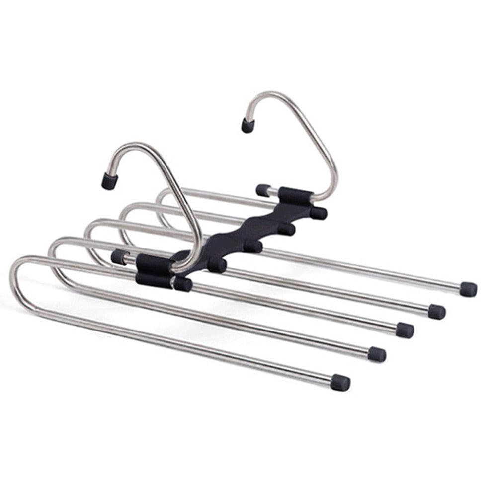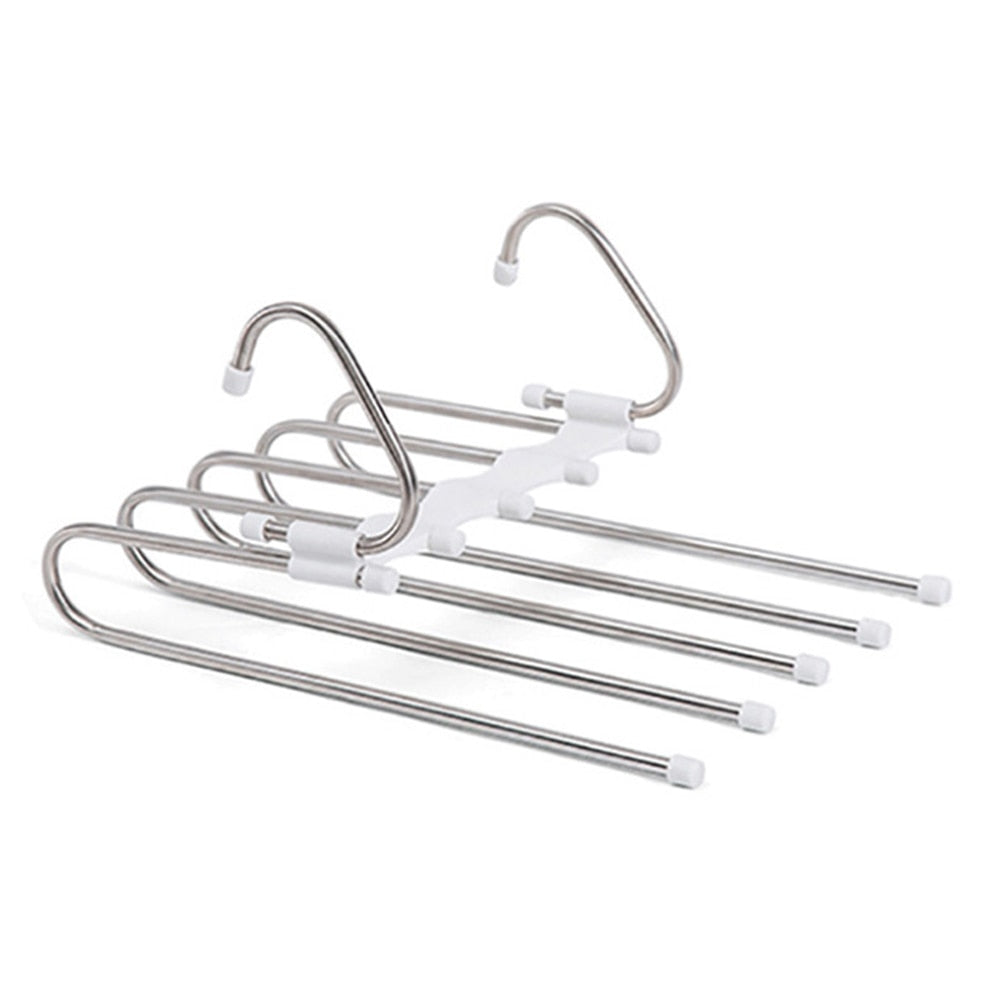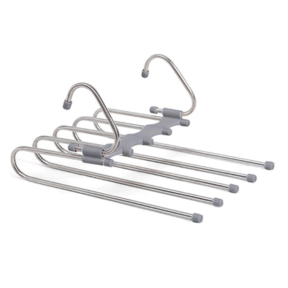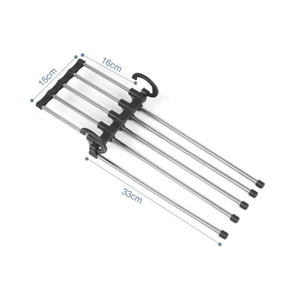 Den multifunktionella byxhyllan håller dina byxor rena och snygga och sparar mer utrymme. Det finns två krokar på toppen. Du kan använda två krokar för horisontell upphängning eller bara använda krokar för vertikal upphängning. Fem rör av rostfritt stål används, som var och en kan dras utåt för enkel upphängning och återvinning. Den är perfekt för resor eller affärsresor och kan även användas som torkställning.
