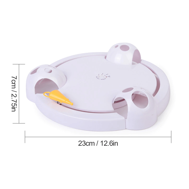 Pounce Cat Toy är en automatisk, roterande kattleksak med en elektronisk mus som åker runt på den cirkulära banan, zoomar framåt, vänder riktning, gömmer sig under hinder och ibland rycker fram och tillbaka. Den oförutsägbara rörelsen stimulerar din katts naturliga instinkt att jaga, jaga och kasta sig över bytet.