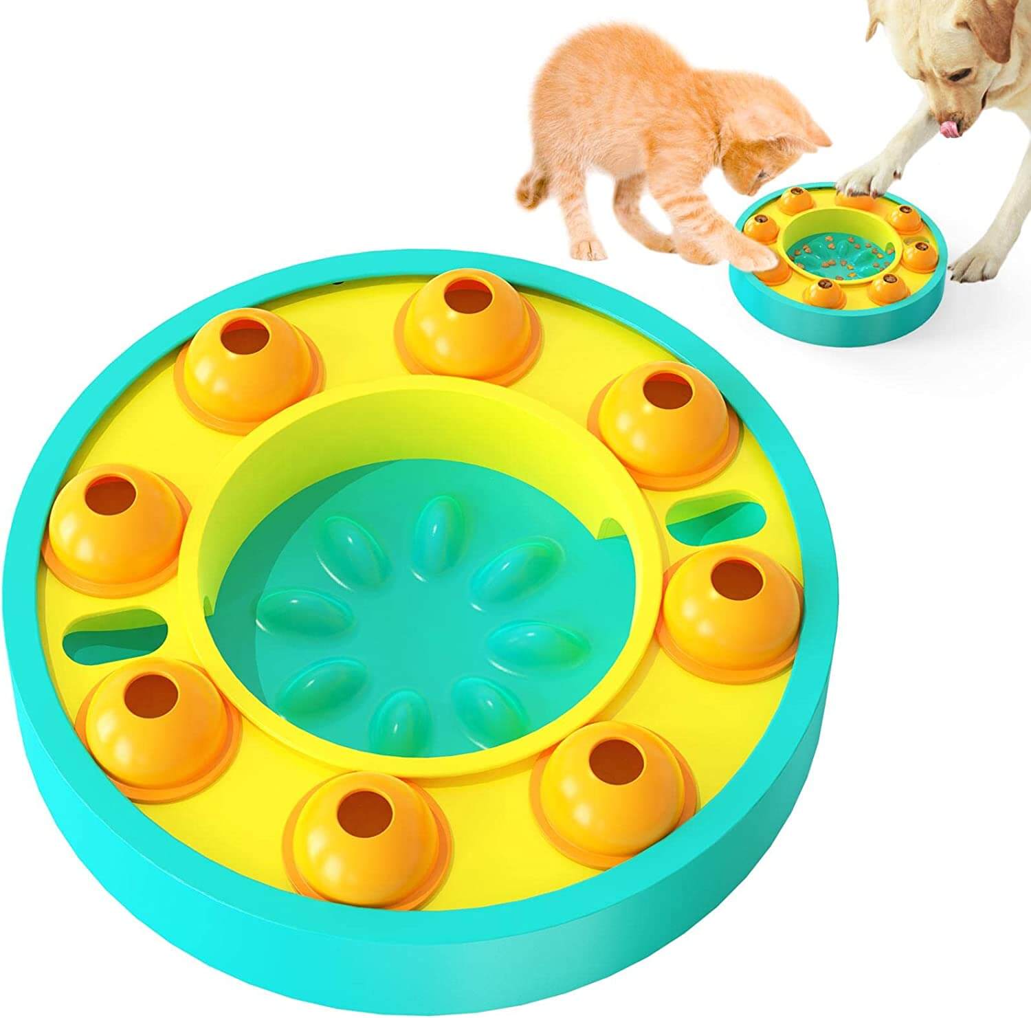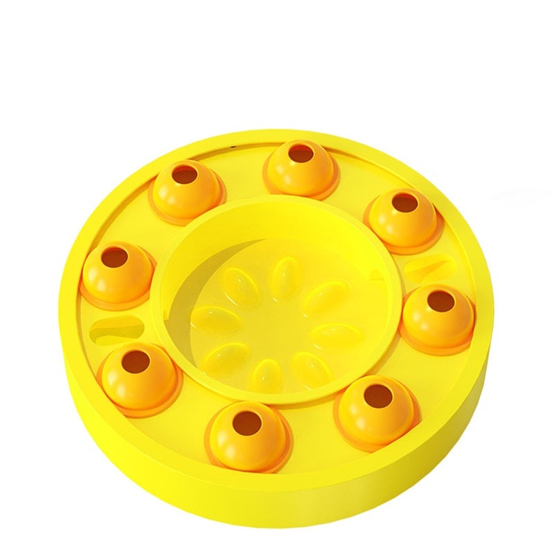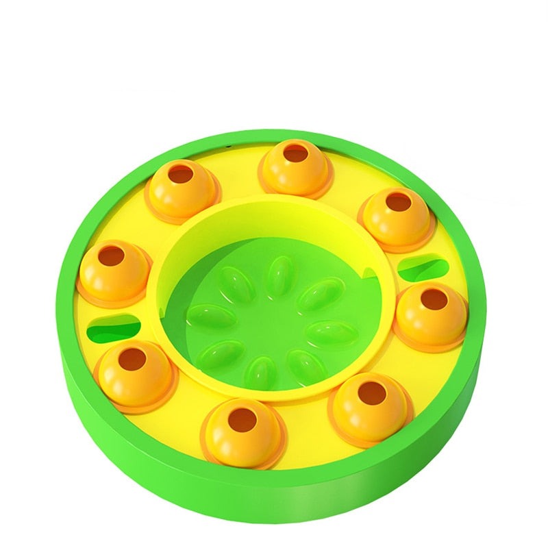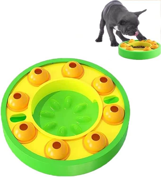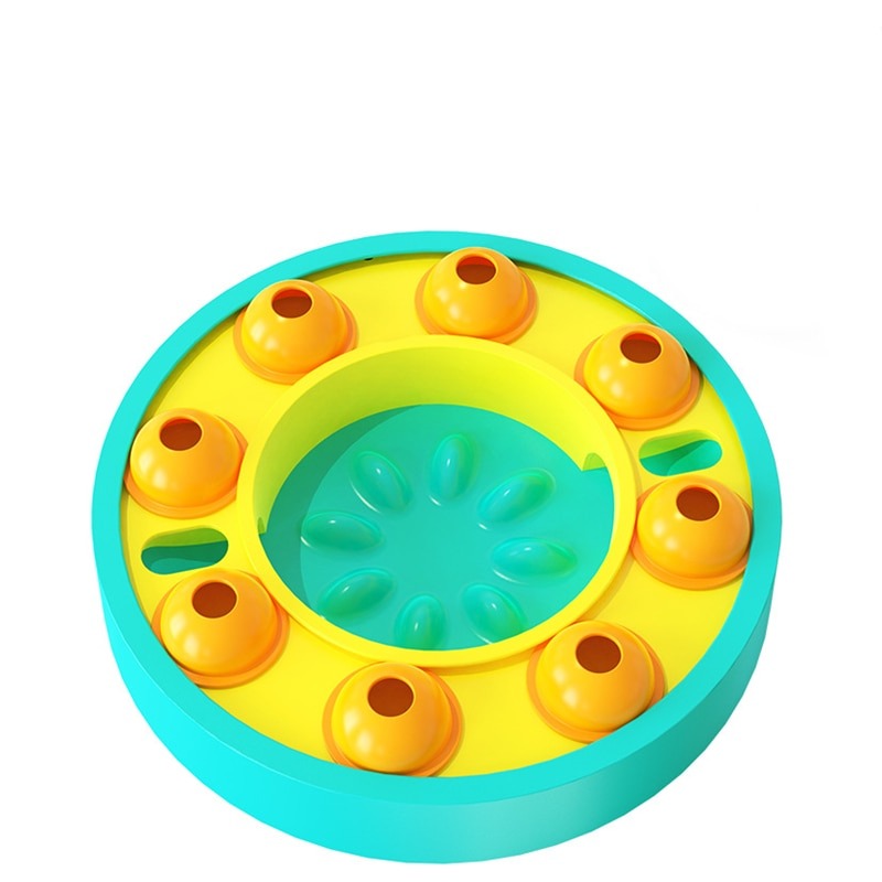 Leksakens överdel är utformad med en skivspelare för matläckage, och det finns flera roterbara matläckningslådor på skivspelarens spår. Hundmat eller snacks kan läggas i hålet på toppen av matläckningslådan, hunden tumsar kornlådan med klorna.
