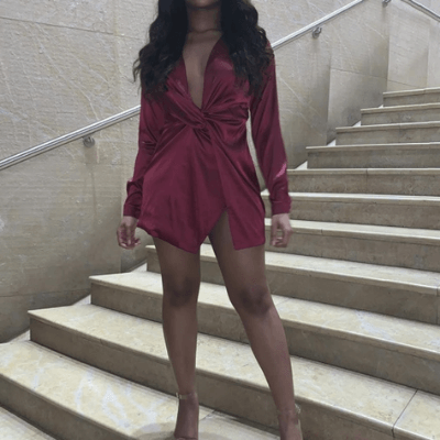 MINNE: Den här klänningen kommer definitivt att bli en huvudvändare och en showstoppare. Den har en sexig djup V-hals medan satintyget faller ner längs din kropp på ett elegant sätt.