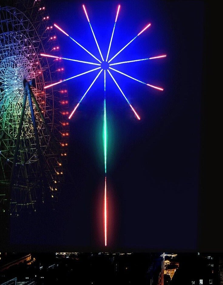 Det dubbelsidiga limmet är fäst vid en specialtillverkad sladd, vilket garanterar den bästa ljusupplevelsen. Med inbyggda RGB-lampor är denna fyrverkerilampa det perfekta tillägget för alla dina nattliga evenemang: fester, semestrar eller familjesammankomster.