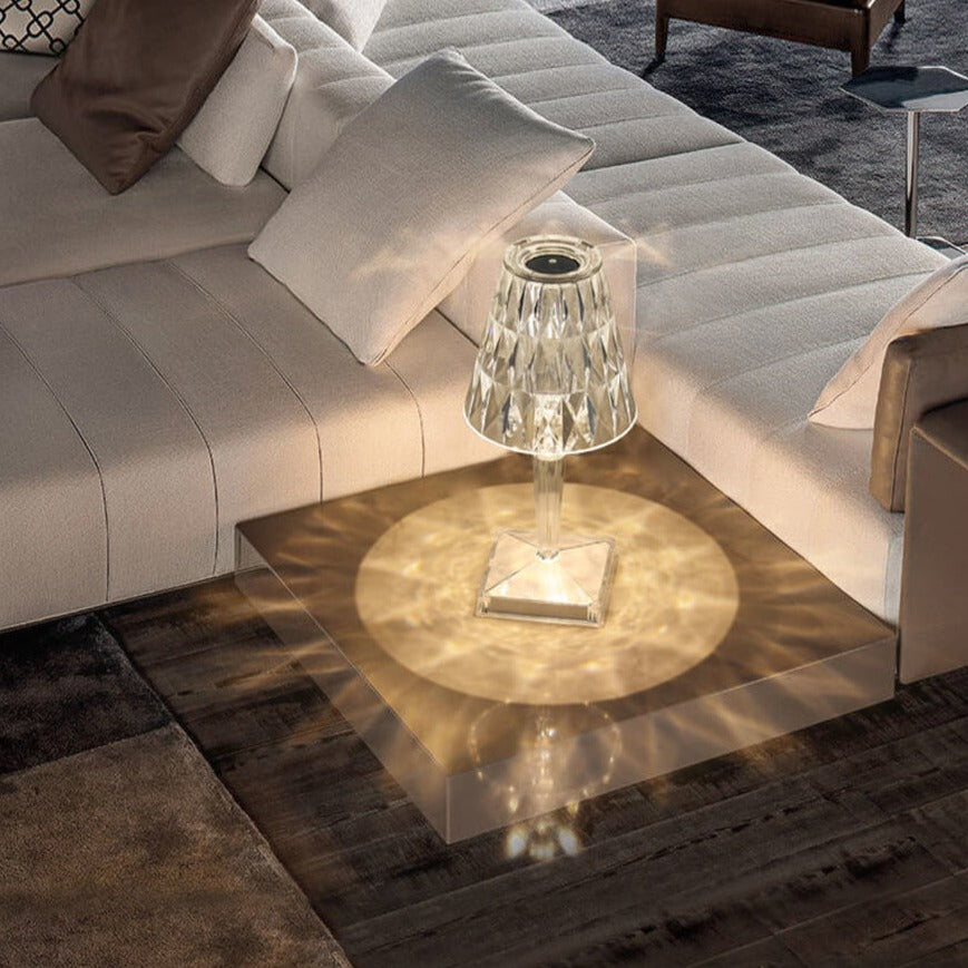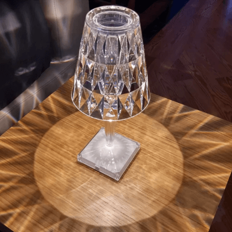 Den här moderna bordslampan är en mild men ändå kraftfull ljuskälla som tar ett vanligt hushållsföremål och förvandlar det till en iriserande konstform. Lampan har en kristallfärgad hatt med en facetterad yta som ger ett fascinerande ljus och en struktur av delikata färger.