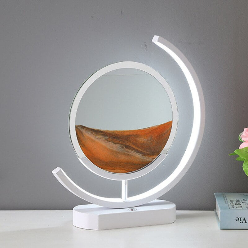 LED-BORDLAMPA: Med inbyggda LED-lampor ger den ett mjukt ljus medan sanden flyttar sig graciöst och skapar en ständigt föränderlig scen.