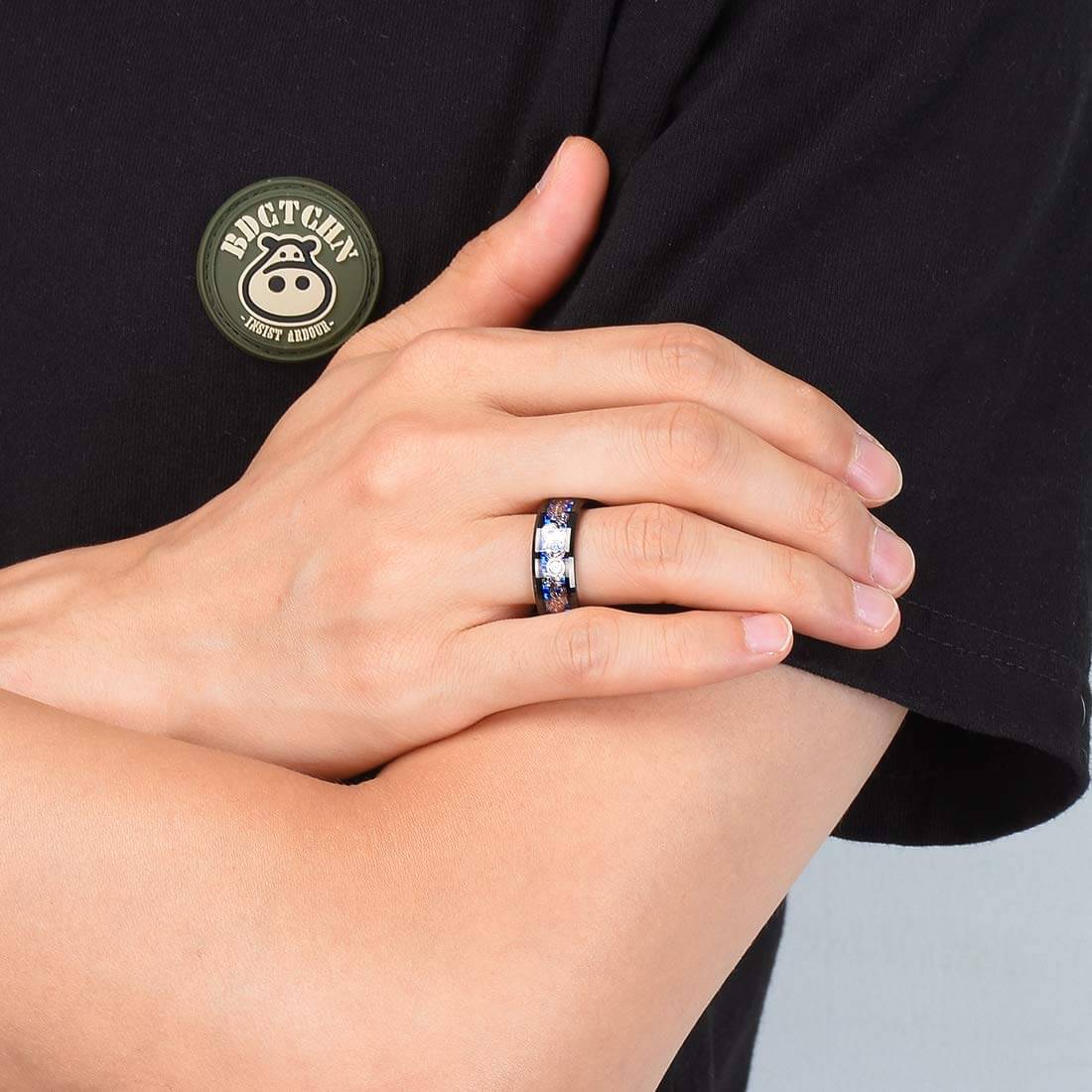 Den tunna linjeinspirerade ringen är briljant utformad med kolfiberinlägg med unika linjeskärningar som ligger i mitten. Ringen anses vara hållbar och kan användas under en längre tid. Det är en perfekt gåva till våra bröder och systrar i blått, särskilt på årsdagar, Alla hjärtans dag och födelsedagar.