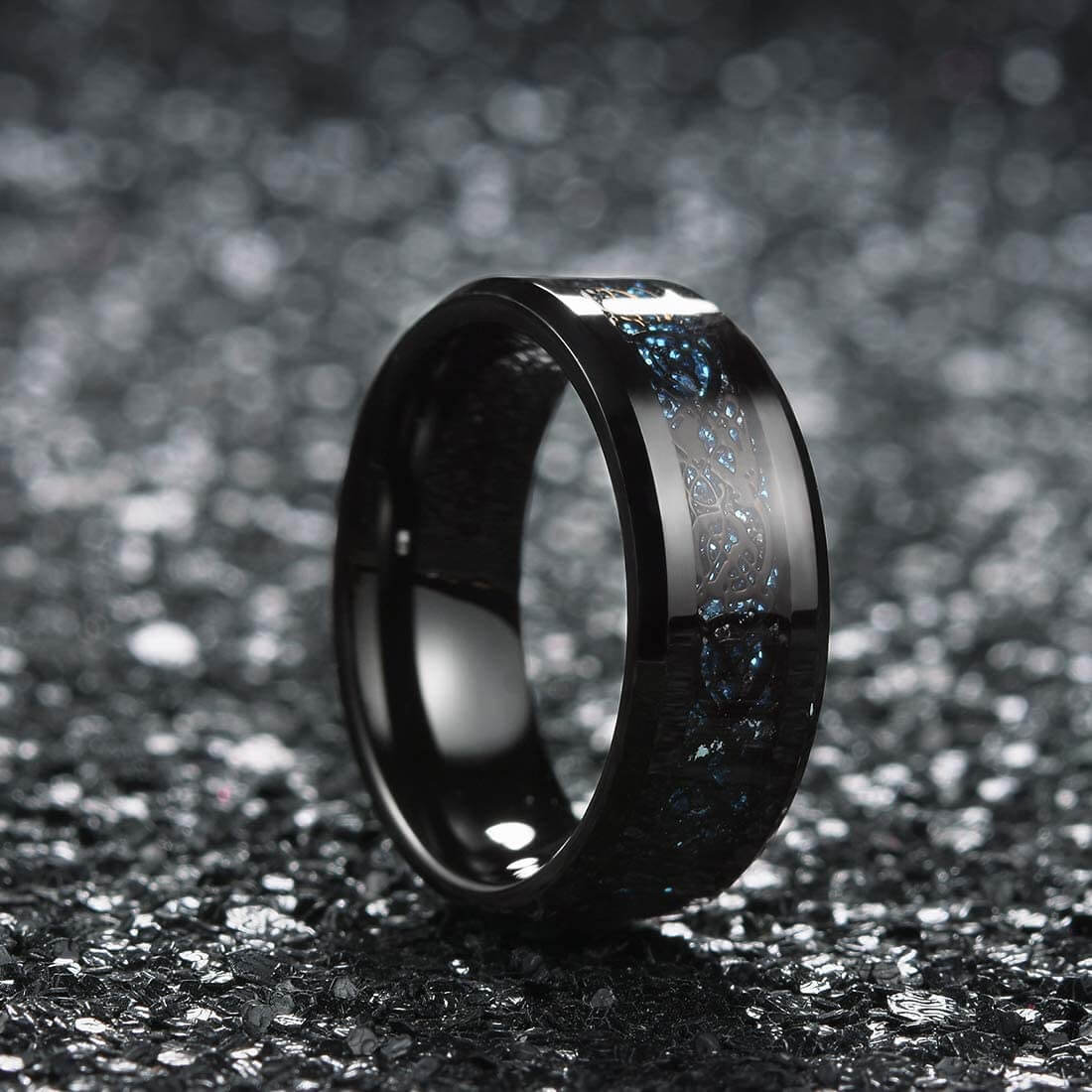 Bär en fantastisk unik, en av de vackraste svarta och blå keltiska ringarna. Tillverkad av högkvalitativ volframkarbid. Ringens yttre fasade kanter har utformats med en polerad svart finish. Ringens mitt har utformats med en svart polerad keltisk drakdesign som vilar ovanpå ett vävt blått kolfiberinlägg.