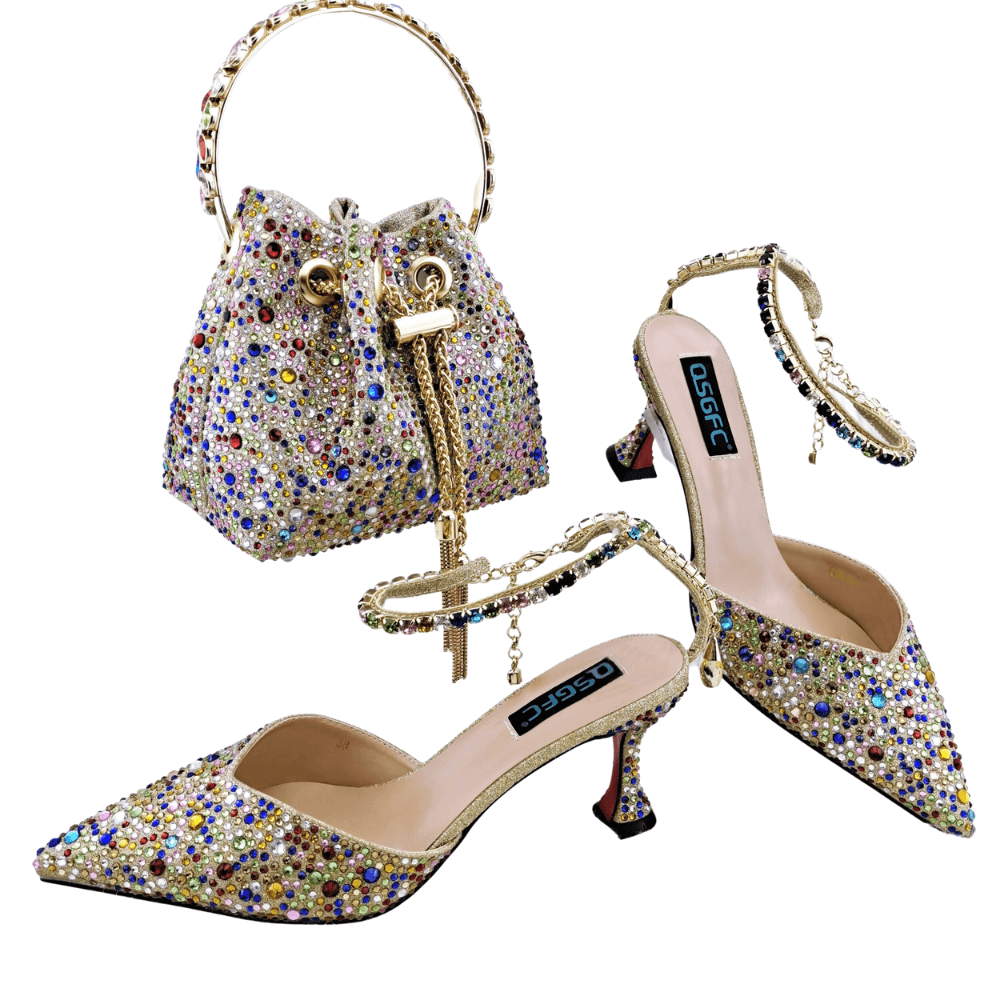 ELEGANTA STRASSPRYDNADER: Höj din stil med skimrande strasshögklackar. Dessa klackar och den medföljande handväskan är dekorerade med bländande strassstenar, vilket ger en touch av glamour och elegans till din look. Strassstenarna fångar ljuset och utstrålar sofistikering, vilket får dig att sticka ut vid alla tillfällen.