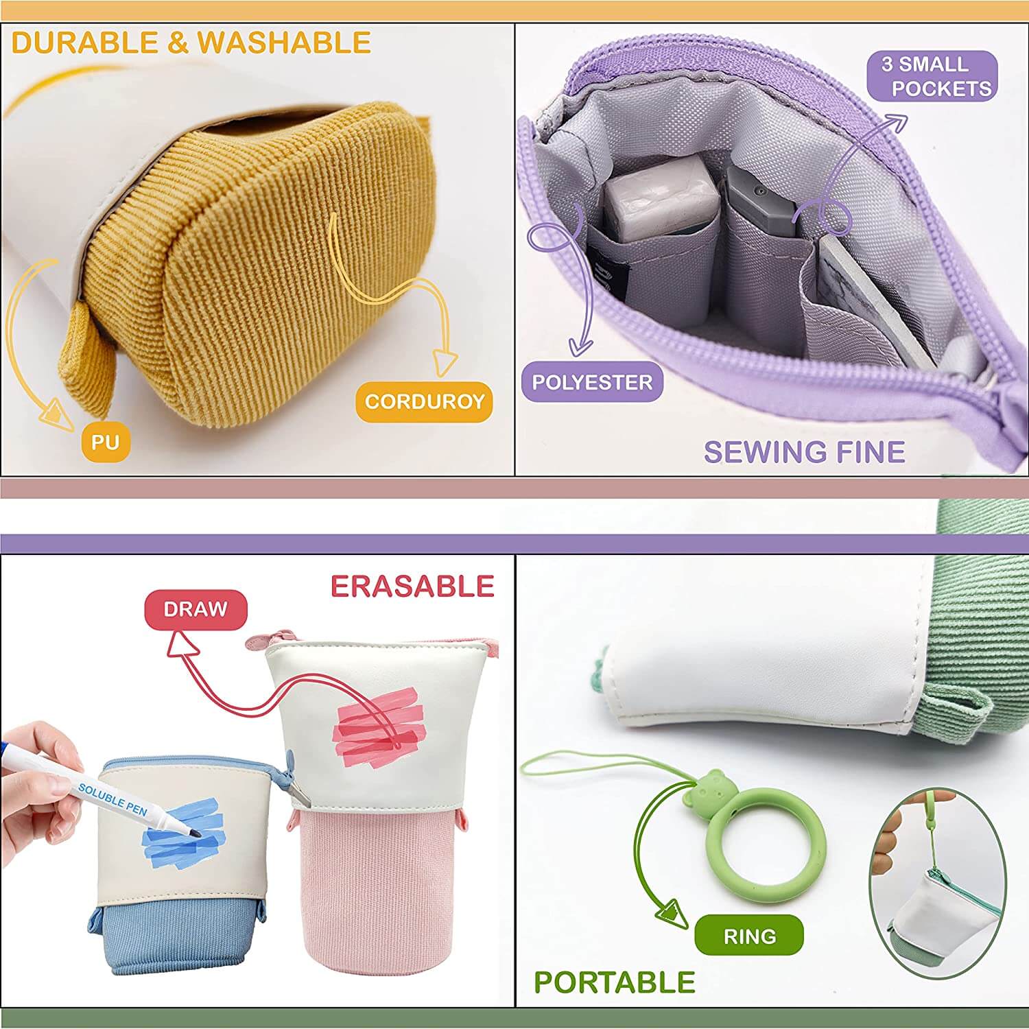 Kreativ design: Det är en unik pop-up-design: pop-up pennfodralet har en unik pop-up-design. Den kan krympas och placeras i en ficka, pennhållaren kan stå på ett bord eller expanderas till ett pennfodral. PU-materialet kan graffiteras med en vattenlöslig penna, och det kan torkas bort med alkohol. Vi har inkluderat en söt björnformad ring som gör pennfodralet lätt att bära runt på.