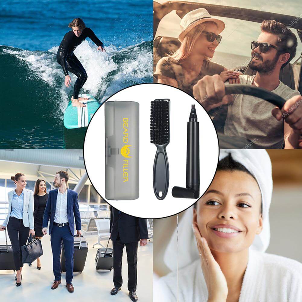 Nu kan du säga adjö till ett fläckigt skägg och fylla på det ordentligt med hjälp av Beard Filler Pen and Brush Kit! Utformad med ett huvud med fyra gaffelspetsar för en mer sömlös look, spetsen gjord med den nya tekniken gör att skägget ser tätare och mer organiserat ut.