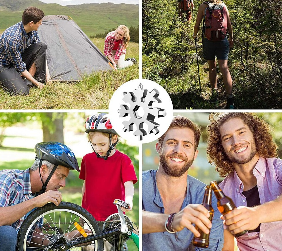 STILIGA ACCESSOARER: Med en distinkt snöflinga-formad design kombinerar detta multiverktyg elegansen hos naturen med funktionella verktygselement. Det är inte bara praktiskt utan ger också en cool och stilfull touch till dina accessoarer. Den rostfria verktygslådan kan användas som en dekorativ nyckelring eller ryggsäcksaccessoar och visar sin coola faktor.