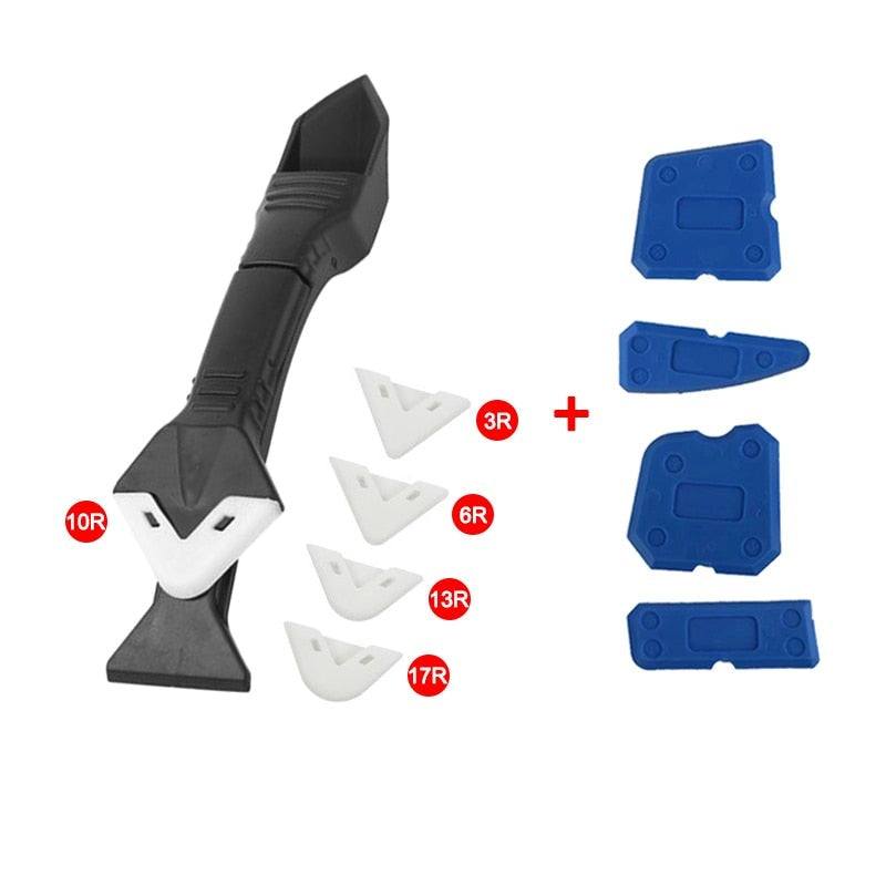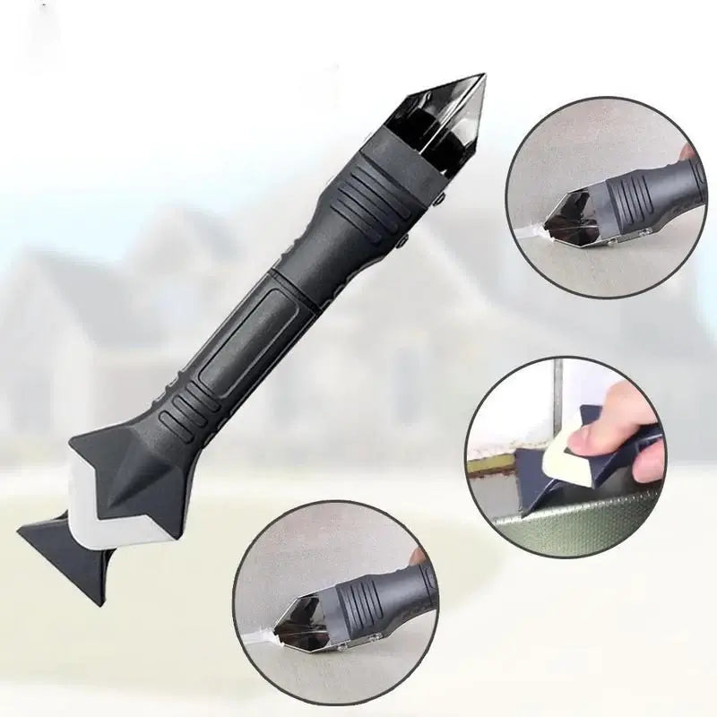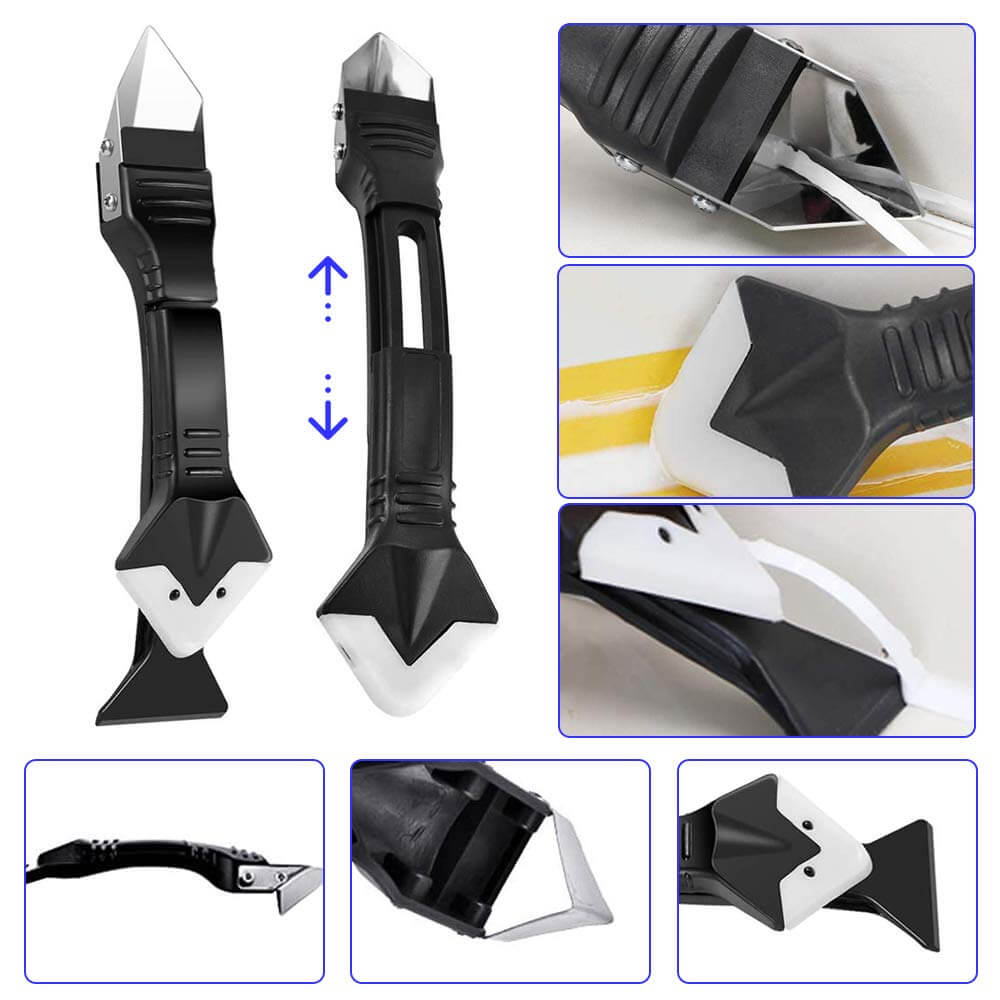 5-i-1 verktyg för tätning: Utformad för att antingen applicera eller avlägsna fogmassa. Kan användas som en silikonspackel, en skonsam skrapa för rester eller ett vasst blad.