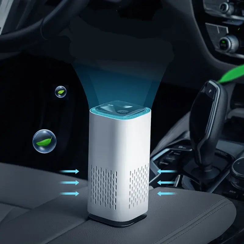 DUAL-USE DESIGN: Denna bärbara luftrenare är speciellt utformad för mångsidig användning i både bilar och hus, vilket ger ren och frisk luft var du än behöver det.