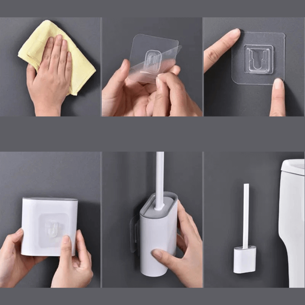 KOMPAKT & PLATSBESPARANDE DESIGN: Denna kompakta toalettborste är utformad för att passa i trånga utrymmen, vilket gör den lämplig både för toaletter och handfat. Den inkluderar även tejp på sidan av hållaren, vilket gör att du kan hänga den på väggen och maximera utnyttjandet av utrymmet.