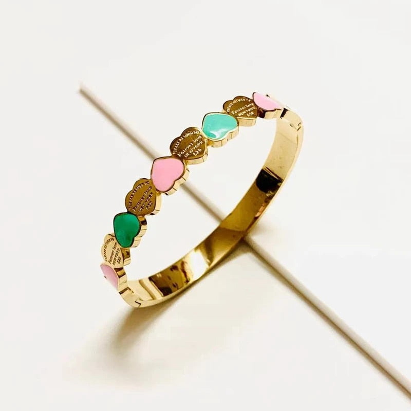Upplev den perfekta blandningen av stil och känsla med vårt armband för kvinnors hjärtformade bangle. Tillverkade av högkvalitativt rostfritt stål med utsökt guldplätering omdefinierar dessa armband lyx och firar kärlekens essens. Inte bara en accessoar, dessa armband är en daglig påminnelse om din stil och de älskade kopplingarna i ditt liv.