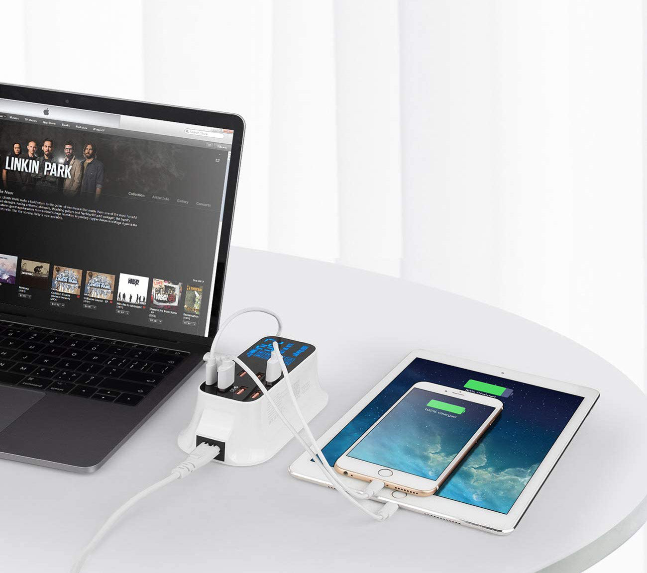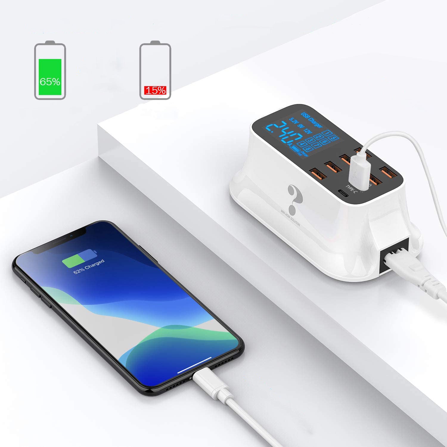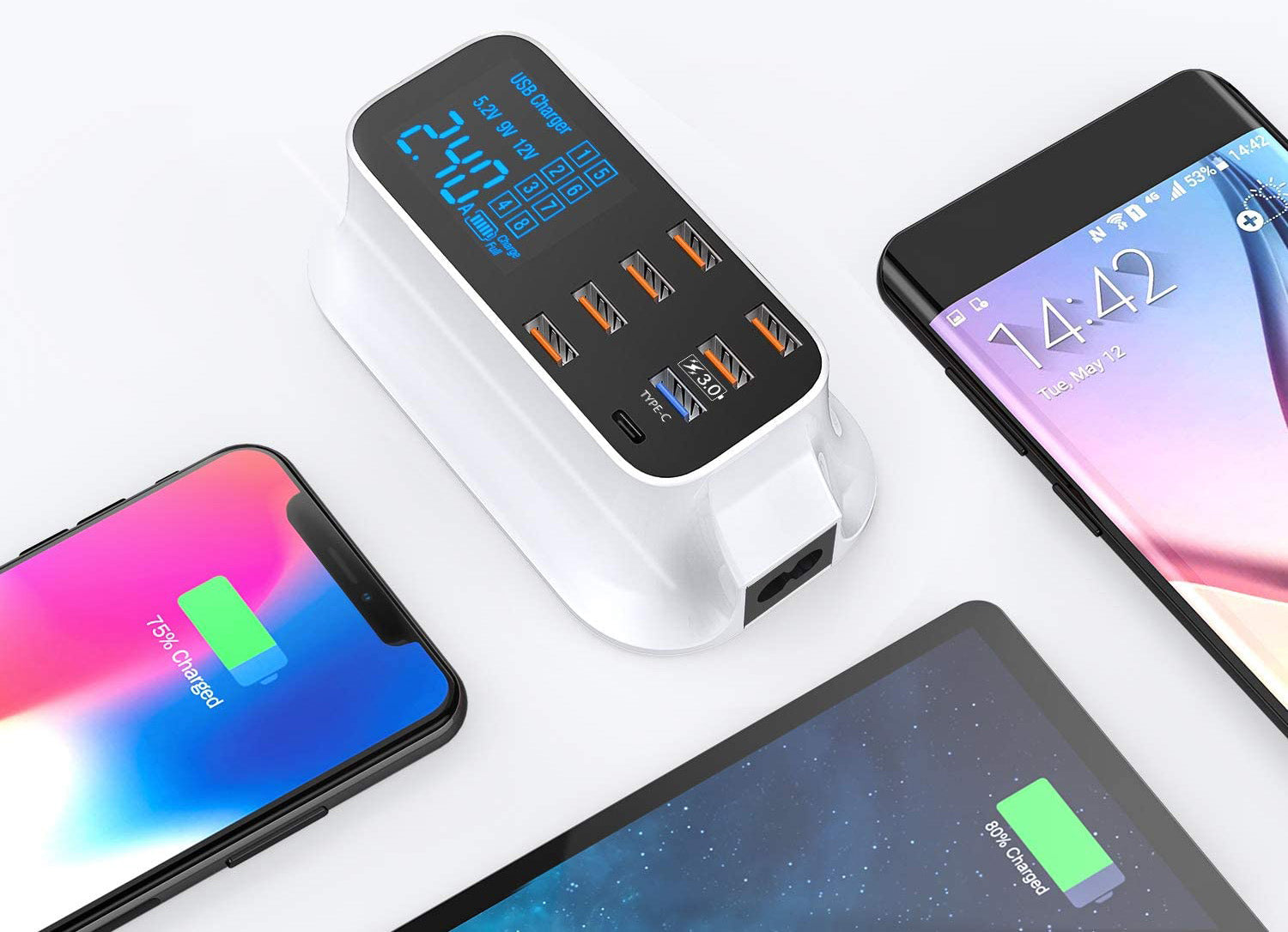 Förvandla ett uttag till en laddningsstation med 8 portar. Med vår laddningsstation kan du ladda alla dina mobila enheter samtidigt. Ett bekvämt sätt att ladda flera mobila enheter på ett begränsat utrymme. Den här laddaren är bra överallt för både hemmet och semester med en prylälskande familj.