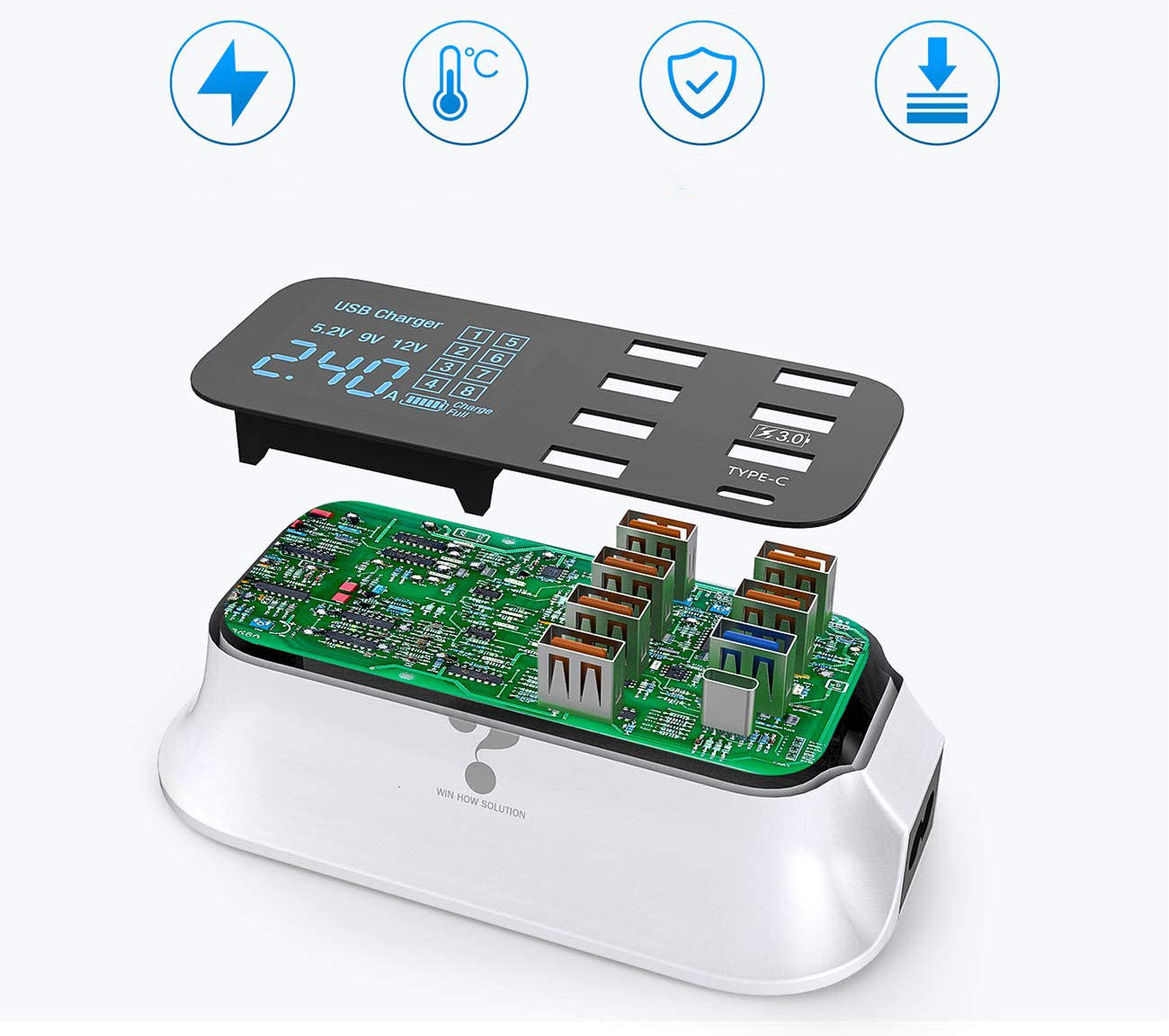 ULTRA STARK: 8 USB-portar ger 40 watt effekt och gör det möjligt att ladda upp till 8 enheter samtidigt i full hastighet.