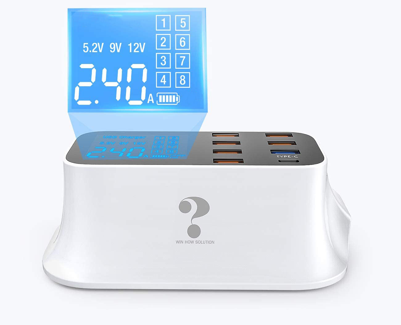 VISUELL LCD-DISPLAY: Detekterar och visar snabbt ström och spänning för olika portar. Perfekt design med LCD-display, ger snabbast möjliga laddning upp till 2,4 ampere per port eller 8 ampere totalt.