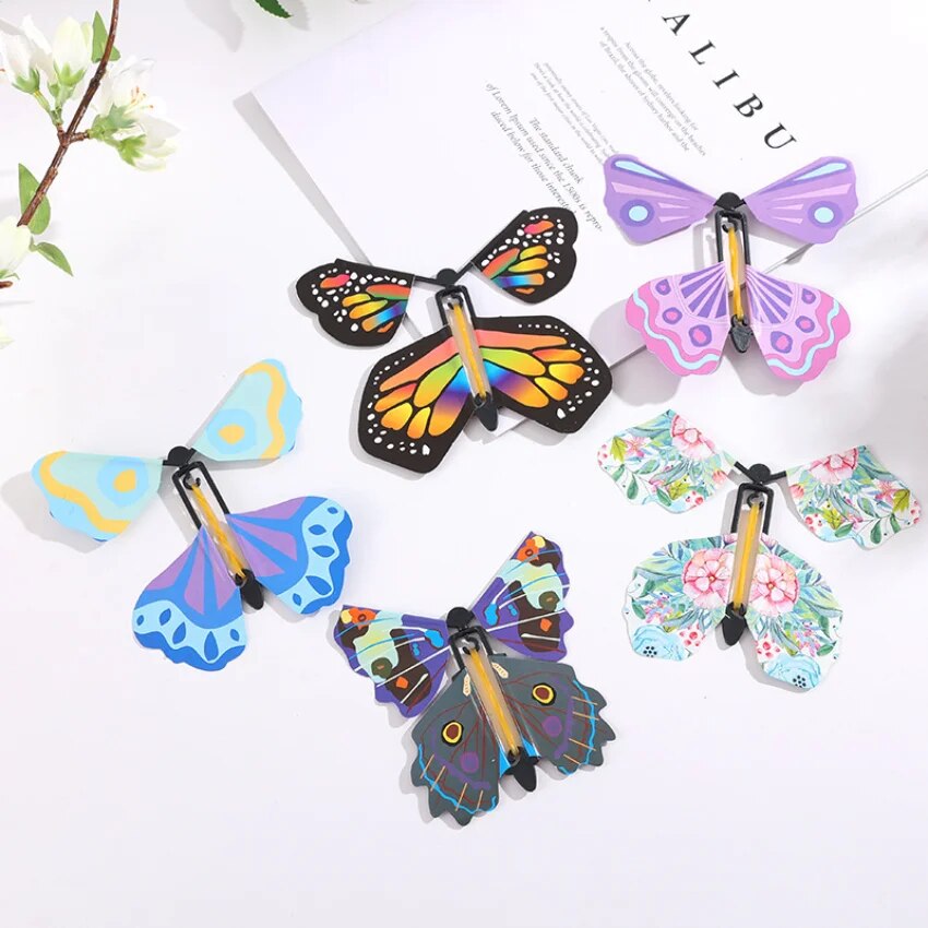 PÅLITLIGA OCH HÅLLBARA: Magiska Flygande Fjärilar är lätta men förvånansvärt tåliga! Använd dem om och om igen! Gummiband, en trådkärna och hållbara pappersvingar kombineras för att ge Flutter Fly utmärkt elasticitet. Vrid gummibandet medurs eller moturs, och fjärilen kommer att flyga åt olika håll.