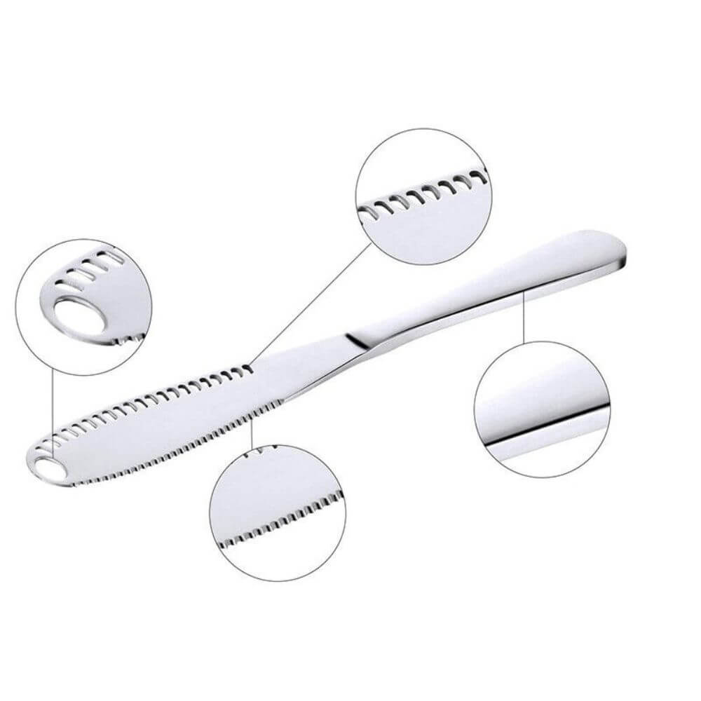 HÅLLBART ROSTFRITT STÅL: Tillverkad av tjockt och robust livsmedelsklassat rostfritt stål är denna Multifunktionella Rostfria Smörkniv designad för hållbarhet, användarvänlighet och långvarig prestanda. Den tål maskindisk, vilket gör rengöringen enkel.