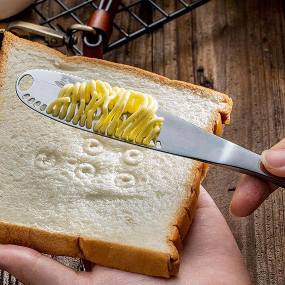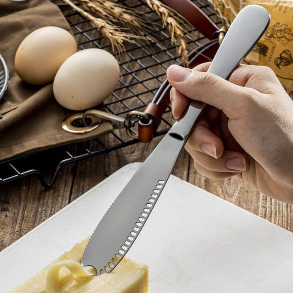 MULTIFUNKTIONELL 3-I-1 DESIGN: Smörkniven har en unik 3-i-1 design som har flera funktioner. Dess tandade kant skär smidigt genom bröd och smör, medan de små urfrästa hålen är perfekta för att locka hårt smör på din rostade brödskiva. Dessutom rymmer det större hålet att locka stora mängder hårt smör, vilket ökar dess mångsidighet.