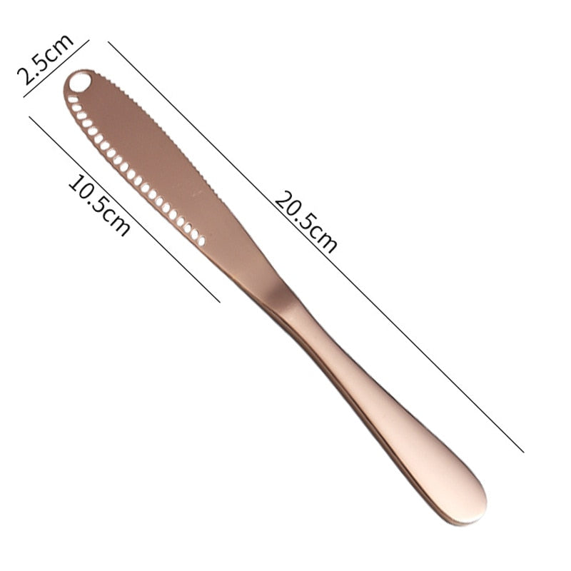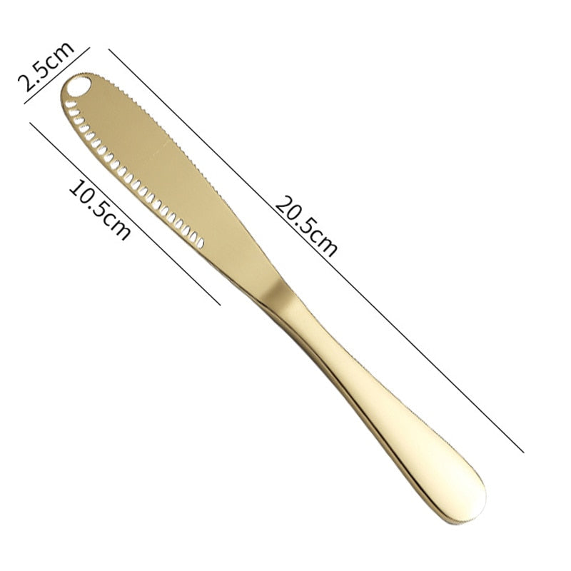 Dess unika 3-i-1 design inkluderar en tandad kant för skivning samt små och stora urfrästa hål för att locka hårt smör på ditt bröd. Oavsett om du njuter av frukost med familjen eller har en brunch, så är vår smörkniv en mångsidig följeslagare som lägger till bekvämlighet och stil på ditt bord. Höj din matupplevelse med detta praktiska och eleganta tillskott till dina köksredskap.