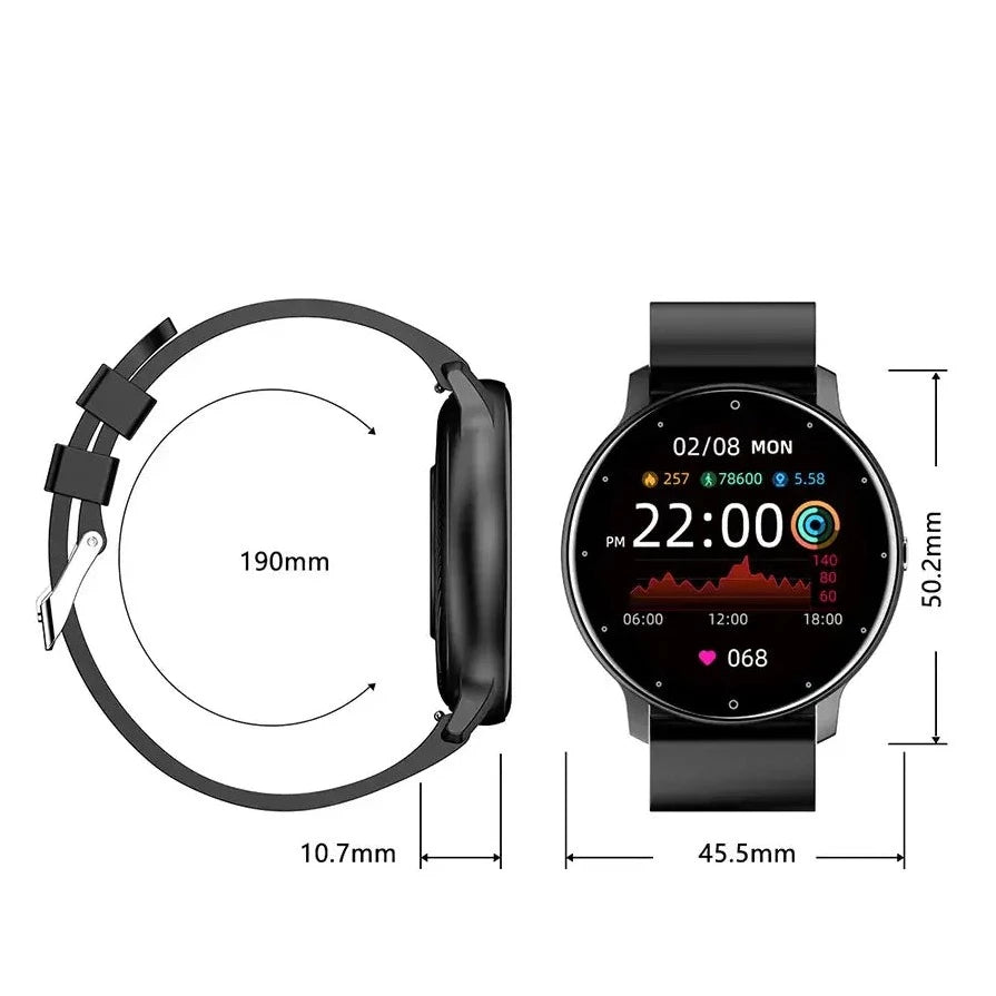 • 24-timmars hälsoövervakning: Denna mångsidiga smartklocka använder avancerad sensorteknik med låg strömförbrukning och hög precision. Den spårar kontinuerligt och automatiskt realtidsdata för hjärtfrekvens, blodtryck, syresättning i blodet och sömnkvalitet. Omfattande dataanalys tillhandahålls för att hjälpa dig leda en hälsosammare livsstil. Fitness-spåraren inkluderar också funktioner som musikstyrning, andningsövningar, stoppur, ficklampa, timer och mer.