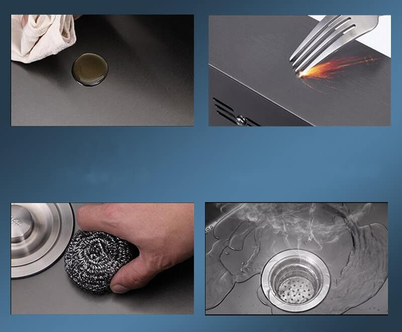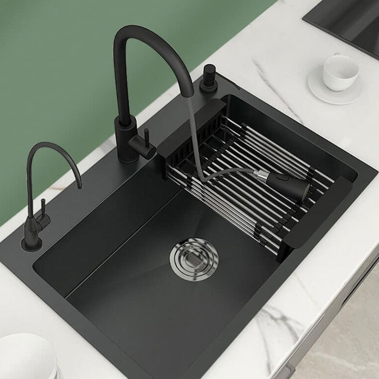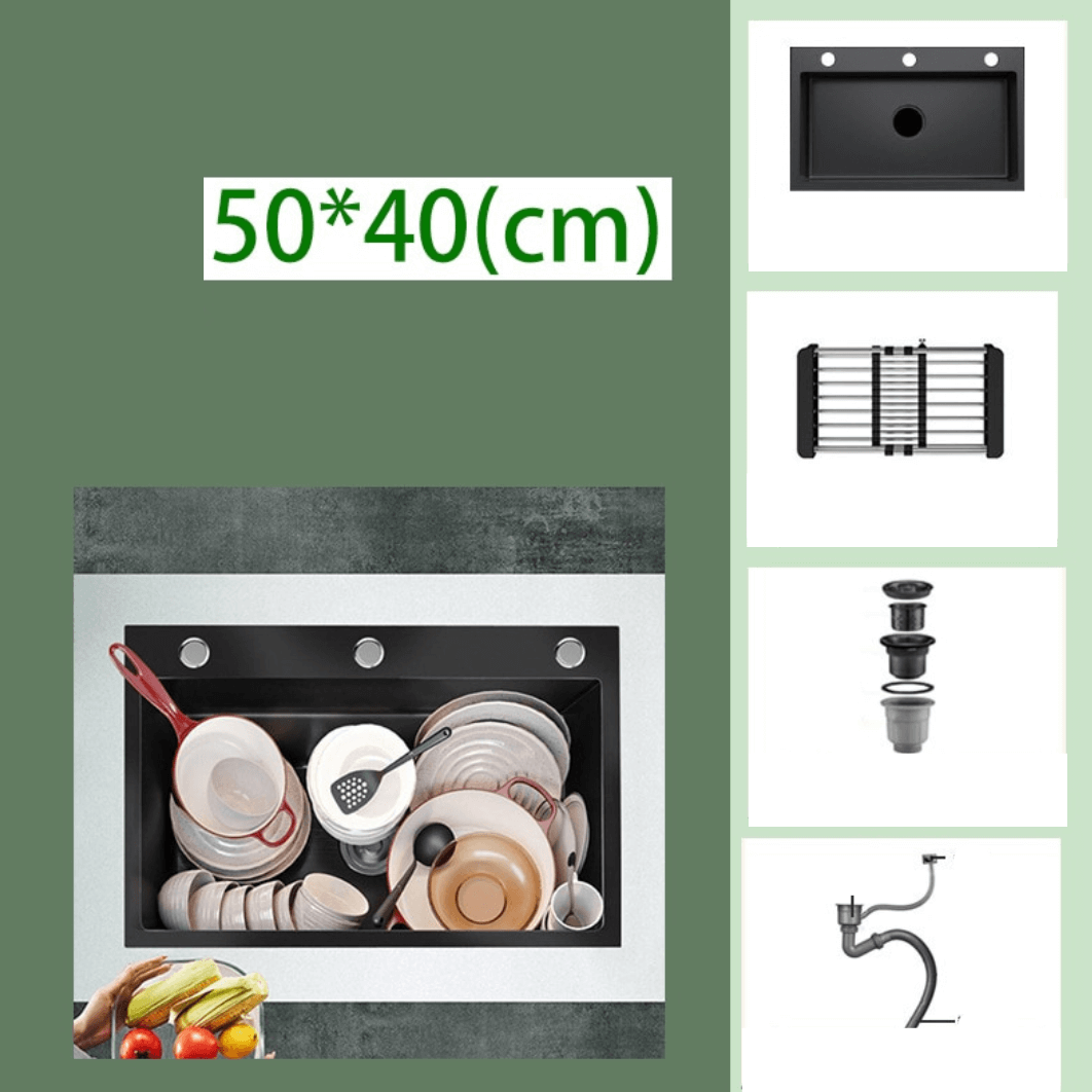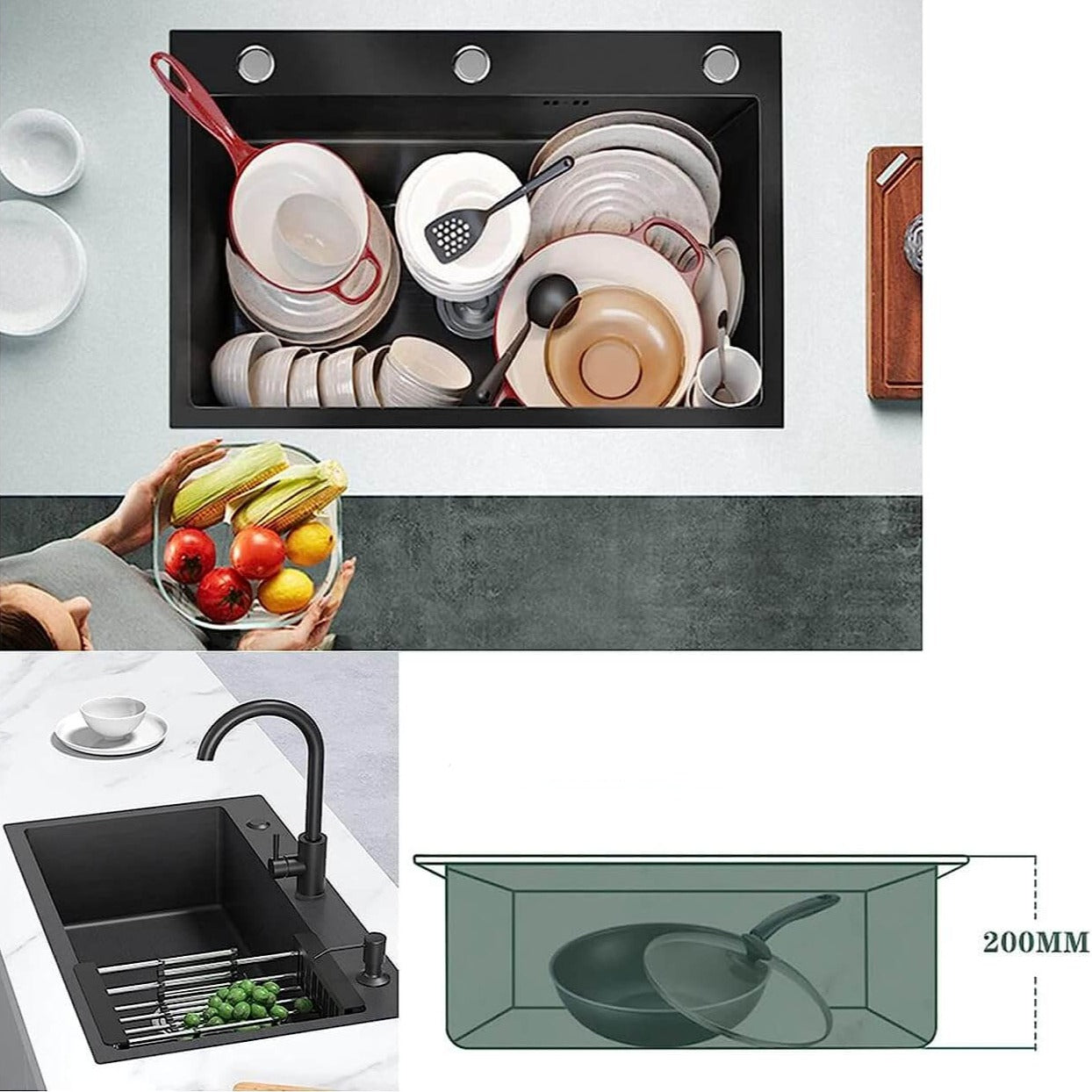 Uppgradera ditt kök till nästa sofistikerade nivå med vår eleganta diskho i rostfritt stål. Den är tillverkad av svart rostfritt stål och avancerad nanoteknik och motstår vattenfläckar, vilket ger en fläckfri yta som är lätt att rengöra. Den mångsidiga designen inkluderar en glidande avrinningskorg som förvandlar den till en bekväm arbetsstation och maximerar kökets effektivitet.