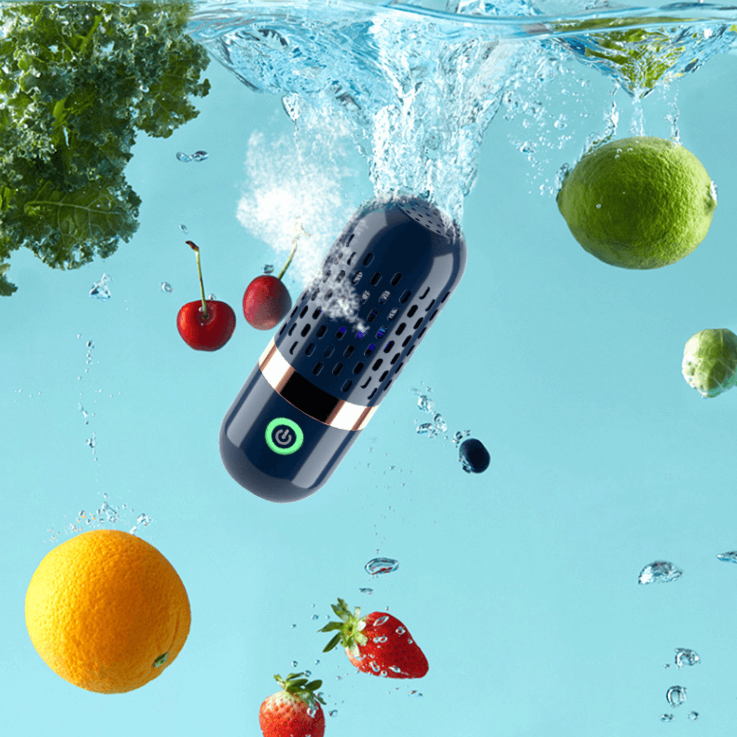 • ENKELT ANVÄNDNINGSFÖRFARANDE: Att använda renaren är enkelt - tryck helt enkelt på knappen och sänk den ner i vatten med din frukt, grönsaker eller andra föremål som behöver rengöras. Denna okomplicerade process säkerställer bekvämlighet och effektivitet utan några komplikationer.
