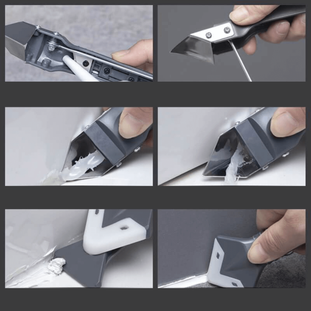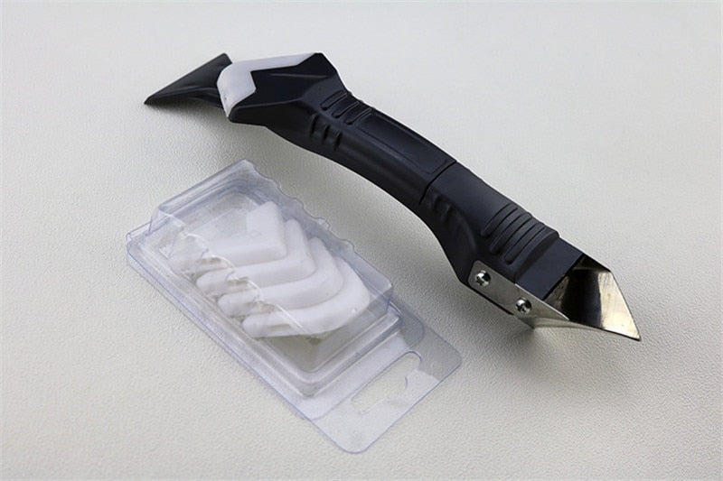 MÅNGSIDIGT 3-I-1-VERKTYG: Höj dina gör-det-själv-projekt med denna Vinkel Lim Skovel Skrapa, som har kombinerade funktioner av en skrapa i rostfritt stål, en spackelspade i silikon och en skrapa i plast och rostfritt stål. Dess mångsidighet täcker olika behov av tätningsarbeten.